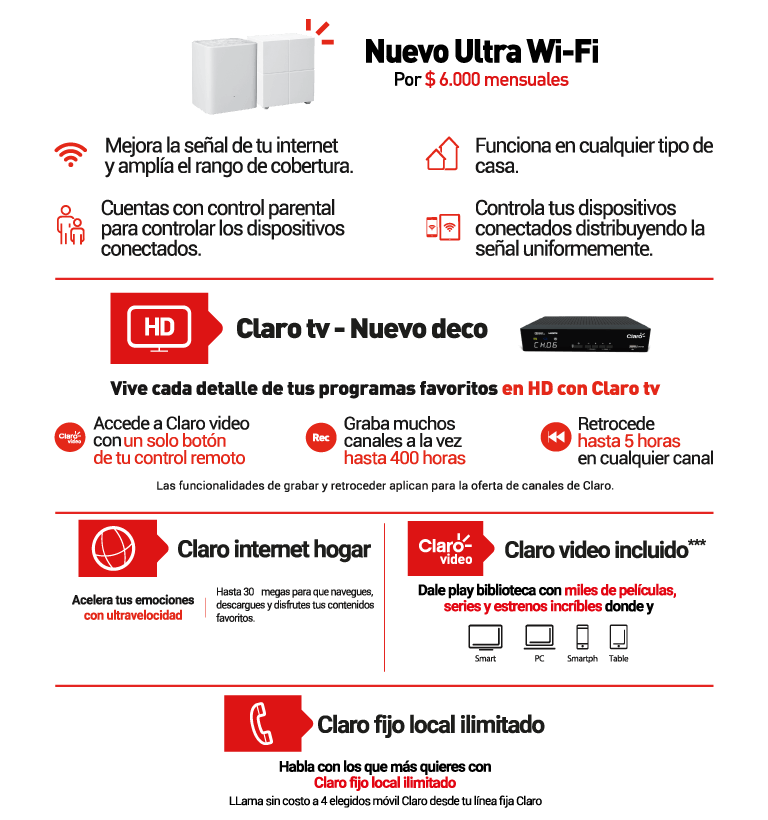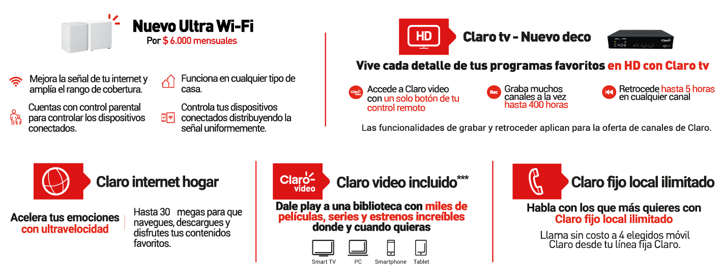 Promoción válida del 1 al 30 de noviembre de 2019. Aplica para clientes nuevos y personas naturales que adquieran Tripleplay en el mes de en el mes de noviembre y empezarán a pagar los servicios básicos contratados en el mes de enero 2020; los servicios adicionales que consumas serán facturados mes a mes. Sujeto a condiciones de riesgo crediticio. La cantidad de megas de navegación depende del plan a contratar y determina la velocidad de navegación que recibas en el cable módem, las cuales podrán reducirse si se utiliza la funcionalidad WiFi de acuerdo a las particularidades del entorno donde se instale el módem y la distancia. La cantidad de canales HD depende del paquete a contratar (tv digital plus o tv digital superior). La oferta de canales no es caracterizada, puede variar sin previo aviso. Para disfrutar el contenido HD debes contar con televisor con tecnología HD. Contrata servicios fijos con o sin cláusula de permanencia; en este último caso deberás pagar el valor del cargo de conexión en la primera factura. Servicios sujetos a disponibilidad de cobertura y viabilidad técnica. Conoce condiciones y restricciones claro.com.co